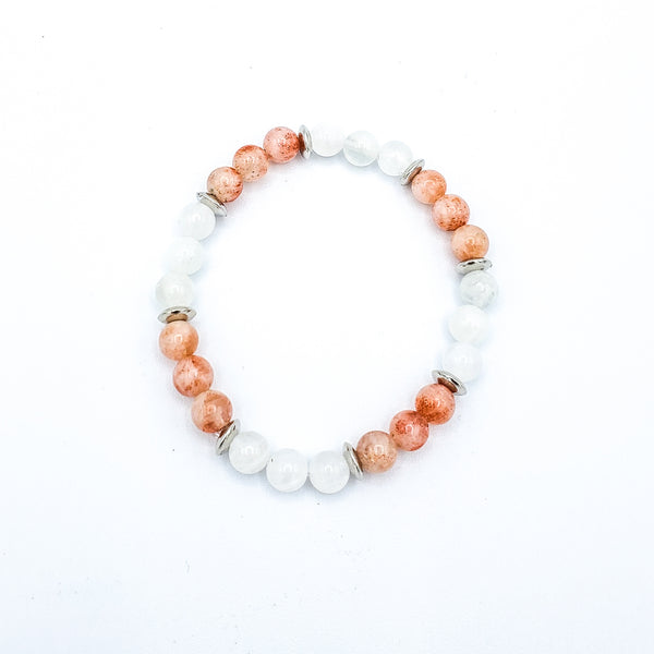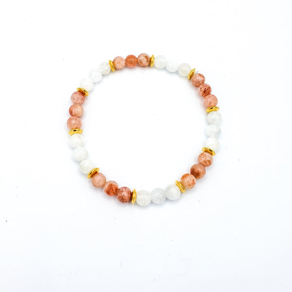 This stunning bracelet combines the energies of Sunstone and Moonstone and together helps awaken ones passion and life purpose.