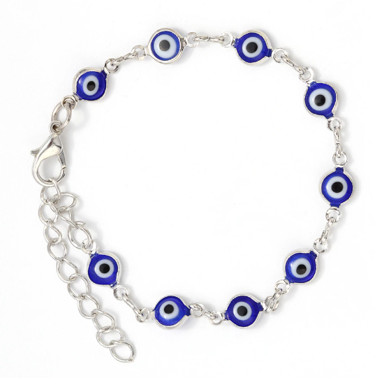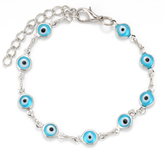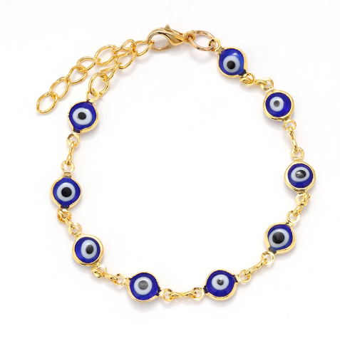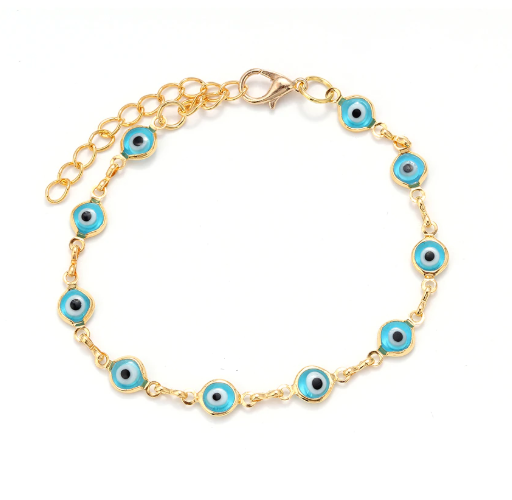 Evil Eye Bracelet with the option of the light or darker blue evil eye stones. Available in gold-plated or silver-plated.